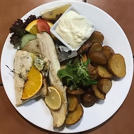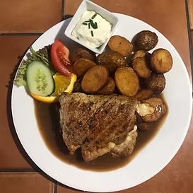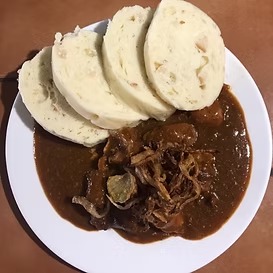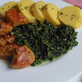 Slowly Roasted Pork Pieces with Potato Dumplings, Cream Spinach or Steamed Cabbage